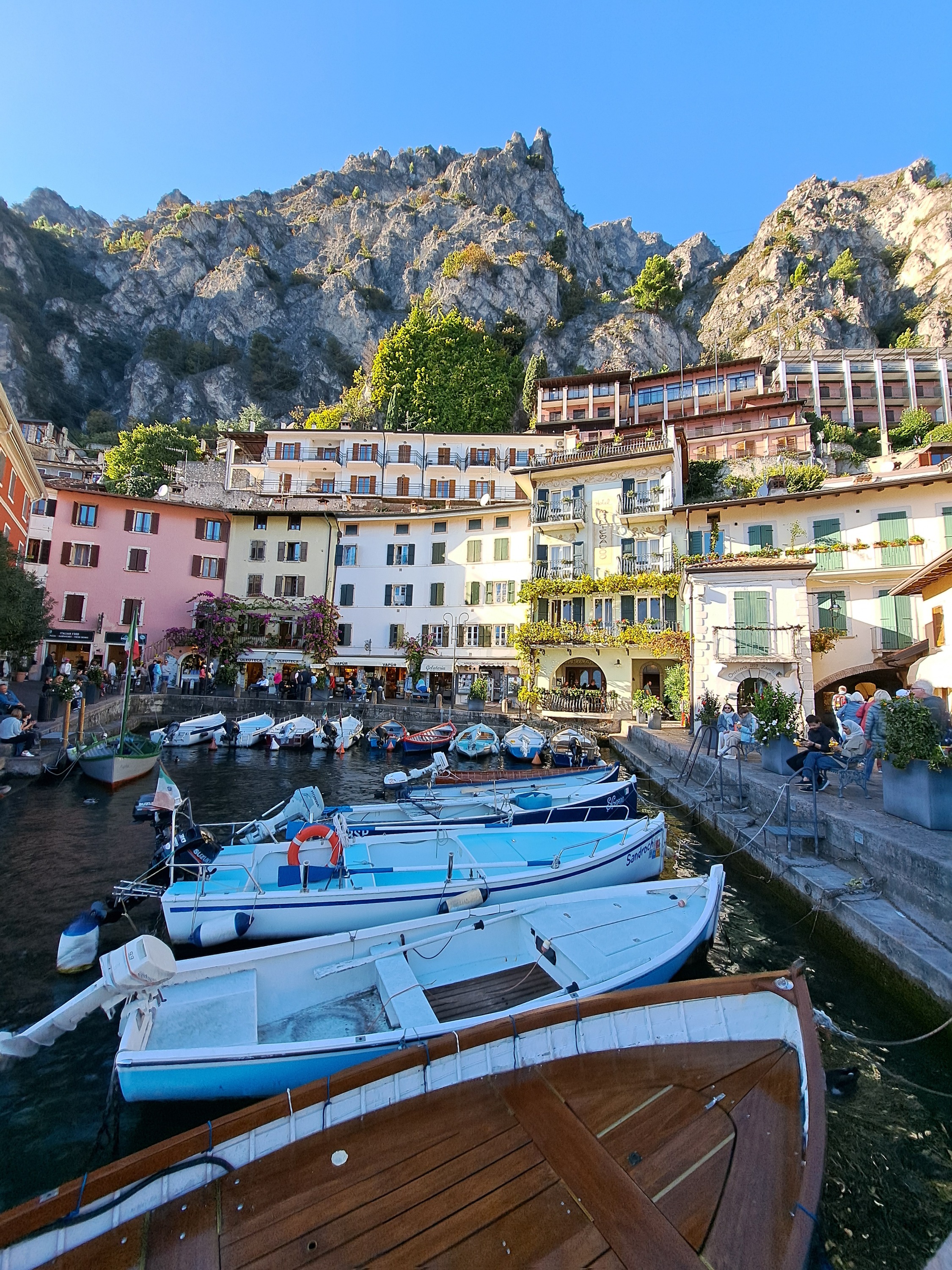 Das hübsche, teils abenteuerlich an die Berge gebaute Limone empfing uns mit Sonnenschein und vielen Touristen, die durch die engen Gassen mit verführerischen Geschäften bummelten. Nun ja, irgendwie muss sich der Rummel für die Einheimischen schließlich lohnen. Uns hat's auch gefallen in Limone.