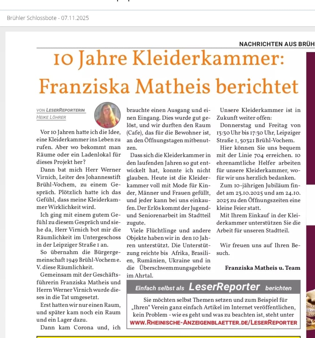 Freude bereiten geht oft so einfach. Es fängt bei den Eltern gegenüber den Kindern an. Wobei sie ja auch die Verantwortung haben. Ich habe einen Zeitungsartikel angehängt, in dem Leute sich dafür starkmachen, im Rahmen ihrer Möglichkeiten für wenig Betuchte in ihrem Stadtteil Verantwortung zu übernehmen. Das ist aber nicht alles, sie unterstützen in einer Bürgergemeinschaft viele weitere Aktivitäten. Ich weiß nicht, wo sie die Kraft hernehmen, aber sie haben es immer wieder, all die Jahre, geschafft, die Bürgergemeinschaft mit ihren Aktivitäten am Leben zu erhalten. Ich wünsche Franziska und Karl Matheis weiterhin die Energie, dass sie die Aktivitäten auch weiterhin mit dem Team bewältigen können.