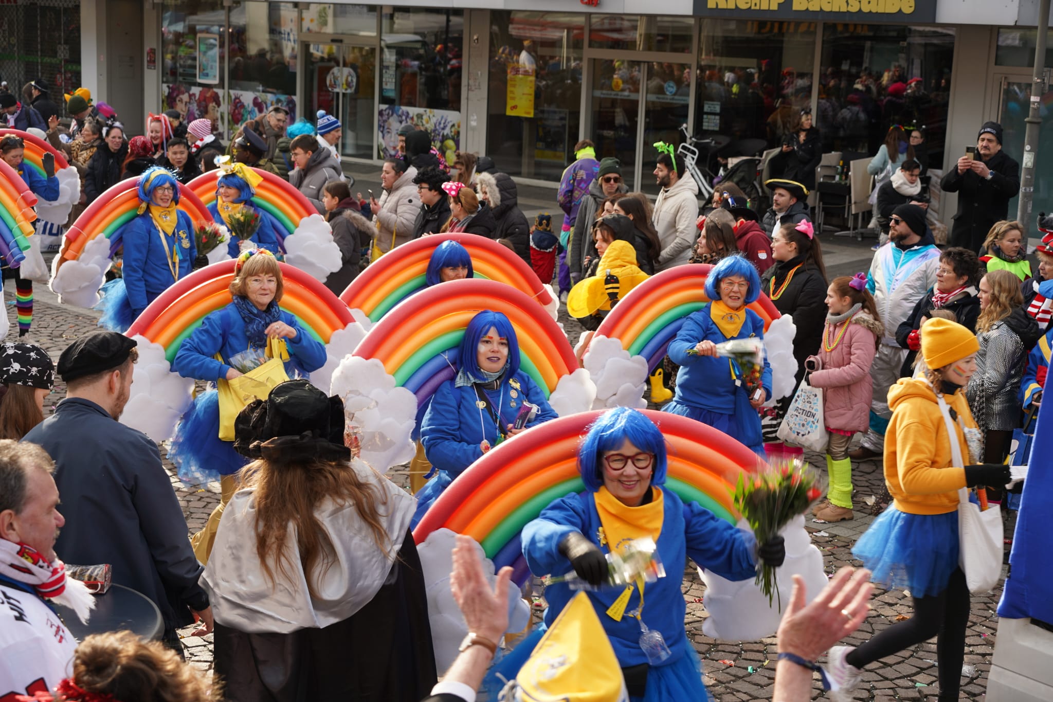 Etliche Zuschauer haben bereits große Tragetaschen voll gesammeltem Wurfmaterial wie Kamelle, Strüsjer, Schokolade usw. Vor allem auf dem Marktplatz und an den Tracks mit Feiernden gleicht das Spektakel einem Hexenkessel und ist schon fast stressig. Schöner Stress, so viel liebenswerte Menschen zu treffen.