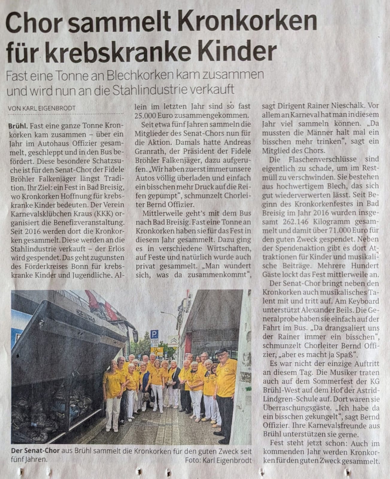 Da macht das Singen im Senat-Chor der Fidele Bröhler * Falkenjäger und natürlich auch das Sammeln der Kronkorken doppelt viel Freude, uns und den Eltern der kranken Kinder, die diese Aktion in Bad Breisig mit ins Leben gerufen haben.